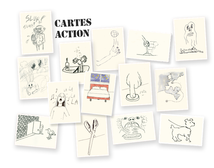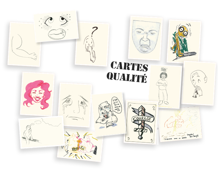 Le principe est de piger une carte personnage, une carte décor, une carte action et une carte qualité et raconter une histoire avec ça...